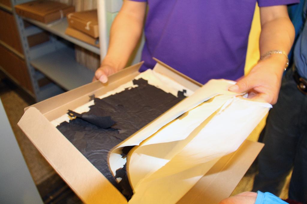 全体人员首先参观了特藏库,即保存旧政权、满洲铁路株式会社等时期档案的库房,档案资料管理处处长于成福详细介绍了2000年以前老式文书档案的立卷方法、排列方式以及鉴定销毁的情况。全体人员就档案库房温控方式、去湿技术、消防技术以及大连市档案馆搬迁的情况同于处长进行了交流。此外,大家还有幸参观了珍贵的纸灰档案,即1905—1945年日本侵占大连期间,日本大连宪兵队、关东州厅、警察部及各警察署的碳化状档案。1945年日本投降前夕,敌警、宪、特机关为毁证灭迹、将档案堆于防空壕中焚烧、因未烧透即用土掩埋而成碳化状,中华人民共和国成立后,经过挖掘整理保存起来,这也是大连市档案馆的专藏。