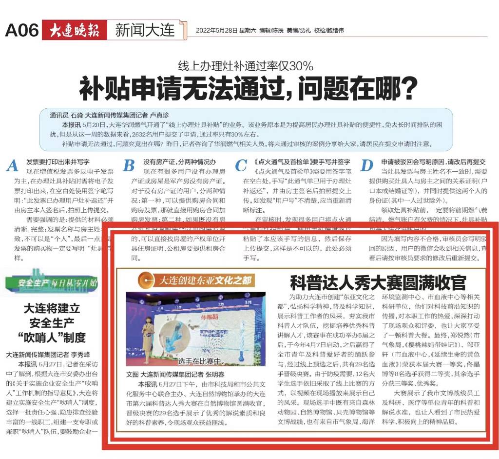 据悉,大连地区已成功举办五届“科普达人秀”活动,此次大赛由大连市科学技术局、大连市公共文化服务中心主办,大连自然博物馆承办。为保证疫情期间选手们顺利参赛,组委会特别开设了视频参赛通道,对科普爱好者和传播者的热情给予最大支持。