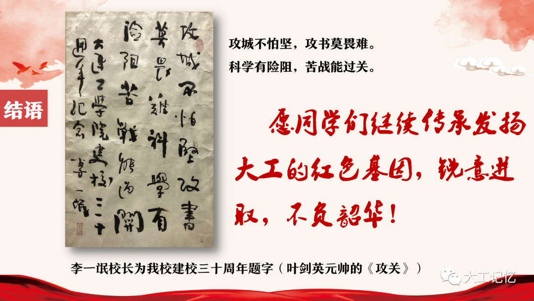 “从革命年代走来,大工人听党指挥,踔厉奋发;向崭新时代启航,大工人栉风沐雨,奋勇争先。从一二九街育英才,到凌水校区谱新篇,一代代大工人用自己的报国热忱和专业知识为祖国做出了无数卓越贡献。继屈老遗风,展大工风采,接力棒已经接到我辈学子手上,“海纳百川、自强不息、厚德笃学、知行合一”,这不仅是前辈对我们的期盼,也是我们新一代大工人向时代的宣言。奋发拼搏的我辈大工人,定将谱写大工新的华章!”