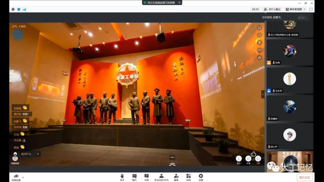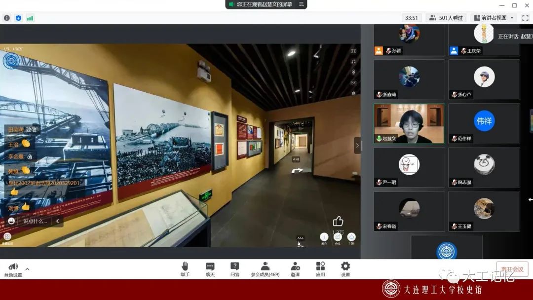 在本次云端讲解中,校史讲解员赵慧文生动讲解了大工70余年的历史,引导访客沿着历史事件轴,从序厅出发,云游沿革厅、屈伯川专展厅等展厅,跟随屏幕一帧帧走过大工启航、奋进和发展的篇章。不仅激发了访客作为大工人的荣誉与骄傲,更令访客切身体会到了学校以传承大工红色基因为主线,将思想政治教育贯穿育人全过程,用红色基因涵养时代新人的教育模式。