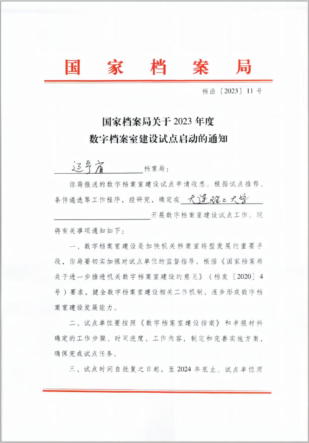近日,经我校档案馆积极申报、辽宁省档案局推荐、国家档案局审批,大连理工大学档案馆成功入选国家档案局2023年度数字档案室建设试点单位。