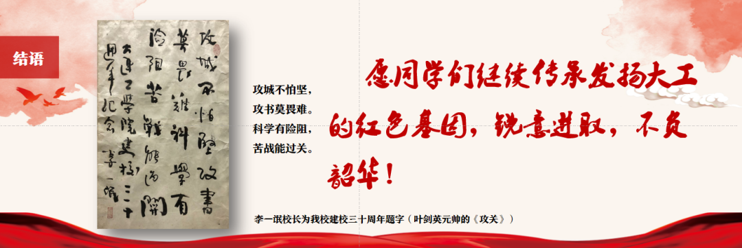 在讲座的最后,刘晓梅引用了我校前身原大连大学首任校长李一氓为我校建校30周年题写的叶剑英元帅的《攻关》一诗作为结语,鼓励2023级新生继续传承大工的红色基因,勇往直前,不负韶华!