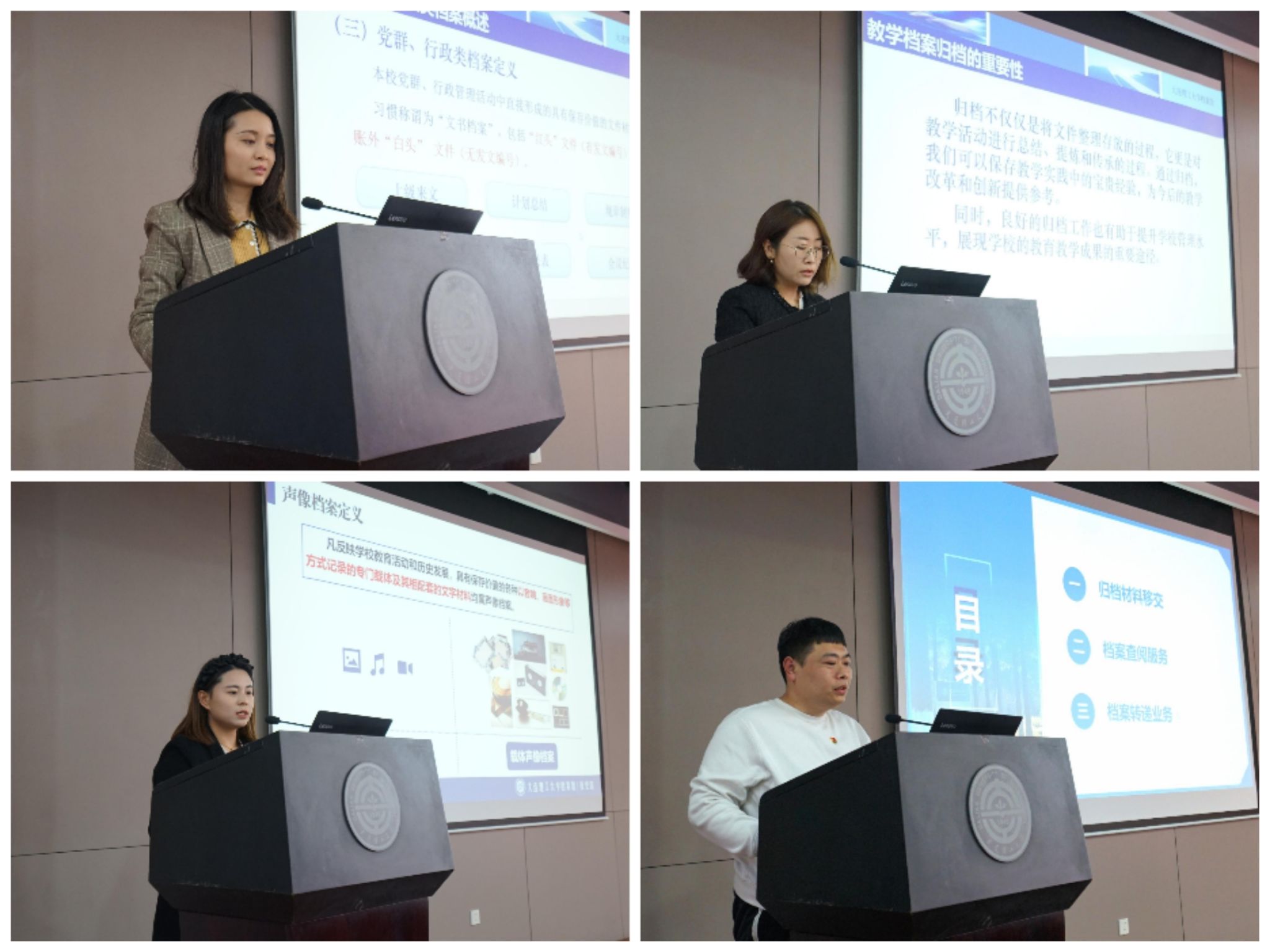 培训会上,档案馆各类档案负责人从学校档案构成、利用服务模式等内容入手,重点介绍了党群、行政、教学、学生、声像、实物类档案的归档范围、归档流程和归档要求等,并详细讲解了档案整理方法与综合档案管理系统操作步骤等。
