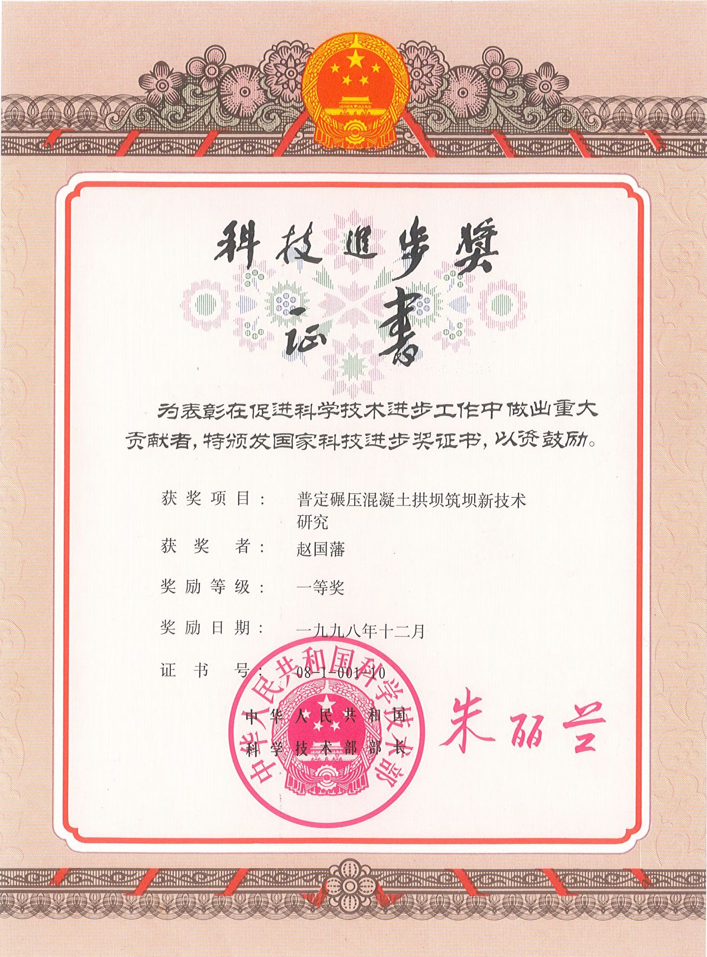 图为赵国藩院士所获国家科技进步奖一等奖证书