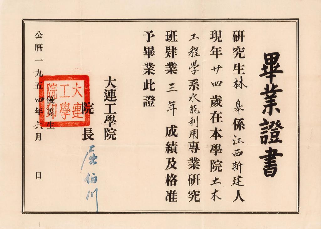 图为林皋院士研究生优等生毕业证书